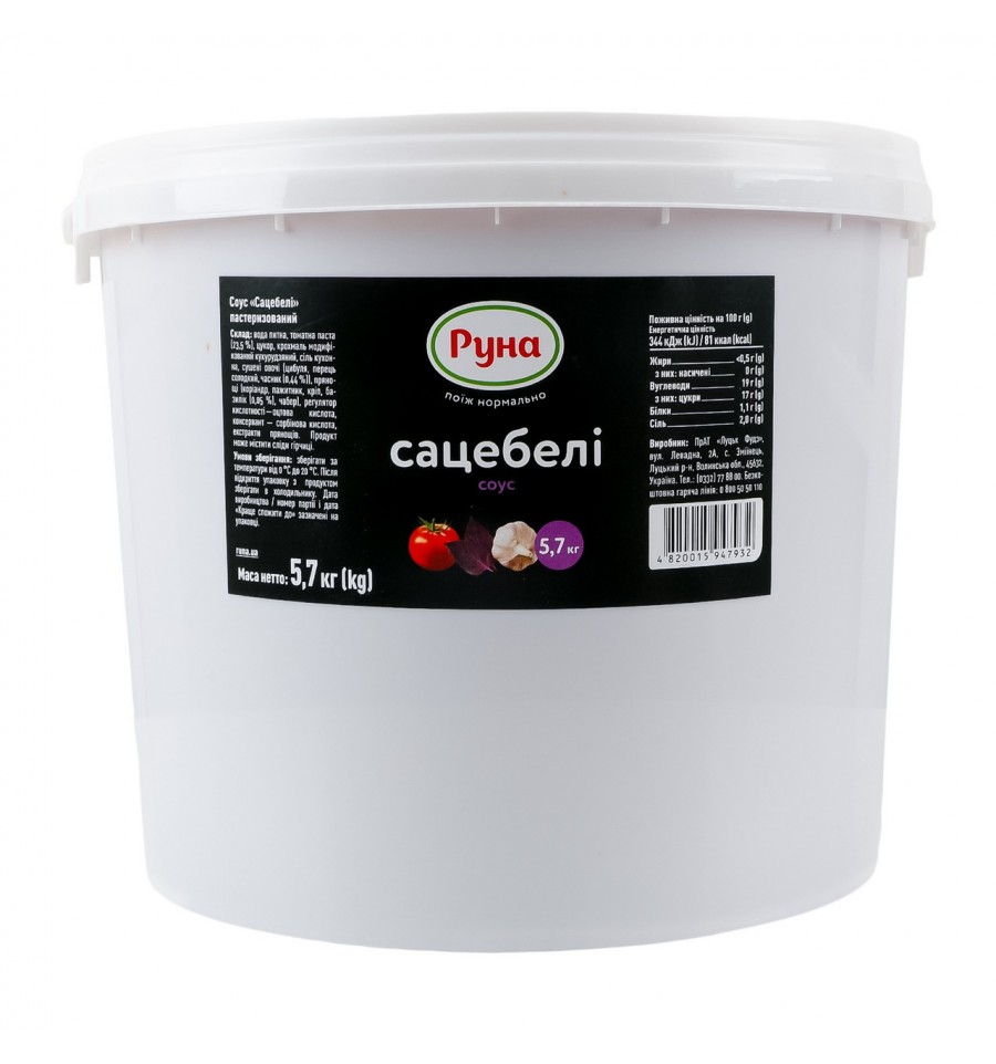 Соус Руна Сацебелі 5.7кг. Склад: вода питна, томатна паста (23.5%), цукор, крохмаль модифікований кукурудзяний, сіль кухонна, сушені овочі (цибуля, перець солодкий, часник (0.44%)), прянощі (коріандр, пажитник, кріп, базилік (0.05%), чабер), регулятор кислотності - оцтова кислота, консервант - сорбінова кислота, екстракти прянощів. Енергетична цінність продукту: 344кДж/100г, 81ккал/100г. Поживна (харчова) цінність продукту: білки - 1.1г/100г, жири - <0.5г/100г, насичені жири - 0г/100г, вуглеводи - 19г/100г, з них цукри - 17г/100г, сіль - 2г/100г. Умови зберігання: зберігати за температури 0..+20ºC. Термін придатності: 6 місяців. Країна виробник: Україна. Виробничі потужності та адреса виробничих потужностей: ПрАТ Луцьк Фудз, вул. Левадна, 2А, с. Зміїнець, Луцький р-н, Волинська обл., Україна, 45632. Маса нетто: 5.7кг.