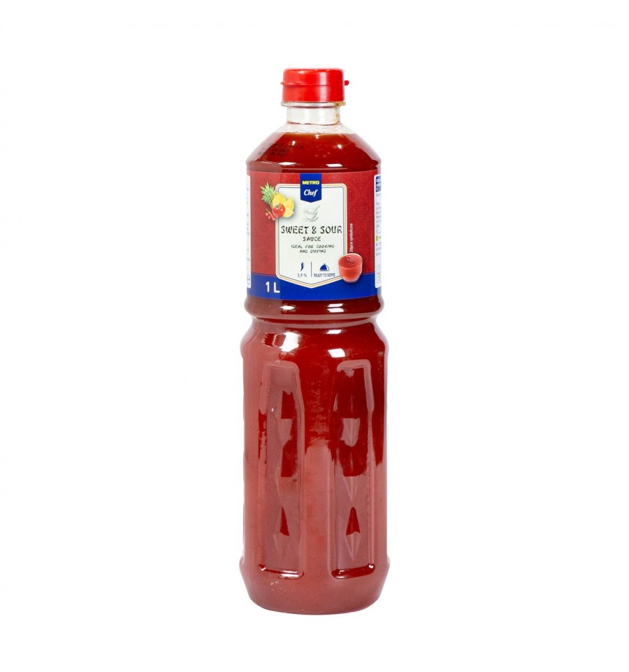 Соус кисло-солодкий, пастеризований продукт, ТМ «METRO Chef». Склад: цукор, вода, концентрат ананасового соку (20%), томати (7,5%), перець чилі (3,9%), оцет, крохмаль тапіоки модифікований, сіль, стабілізатор: ксантанова камедь, консервант: сорбат калію. Енергетична цінність на 100 мл: 777 кДж/183 ккал, жири – 0,2 г, з них насичені – <0,1 г, вуглеводи – 44,2 г, з них цукри – 33,9 г, білки – 0,8 г, сіль – 3,0 г. Умови зберігання: зберігати в сухому прохолодному місці. Після відкриття зберігати в холодильнику та спожити протягом 4 тижнів. Країна походження: Таїланд. Виробник: Exotic Food PCL, 49/42 Moo 5, Tungsukla, Sriracha, Таїланд. Імпортер: ТОВ «МЕТРО Кеш енд Кері Україна», просп. П. Григоренка, 43, м. Київ, 02140, Україна. З питань щодо продукту звертайтесь за тел. гарячої лінії імпортера: 0800 501 401 (безкоштовно в межах України). Маса нетто: 1 л.