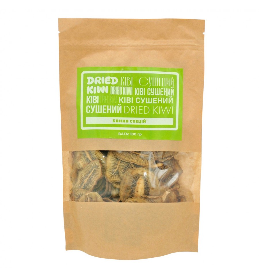 Ківі слайси сушені, 100 г, Банка Спецій. Склад: ківі сушений різаний. Колір - зелений, смак - солодкий, властивий сушеному ківі. Харчова (поживна) цінність 100 г продукту: жири – 0,5 г; вуглеводи – 15 г; білки – 1,1 г. Енергетична цінність (калорійність) 100 г продукту: 1066 кДж (255,0 ккал). Без ГМО. Термін зберігання: 12 місяців з дати. виробництва. Умови зберігання: зберігати за температури не вище 25℃ і відносної вологості повітря не більше 75%. Виробник: ТОВ Банка Спецій. Країна виробництва: Україна. Адреса виробничих потужностей: Тяжилівський тупик, буд.1є, м.Вінниця, 21012, Україна. Вміст ГМО: Не містить вказаної речовини. Маса нетто: 100 г