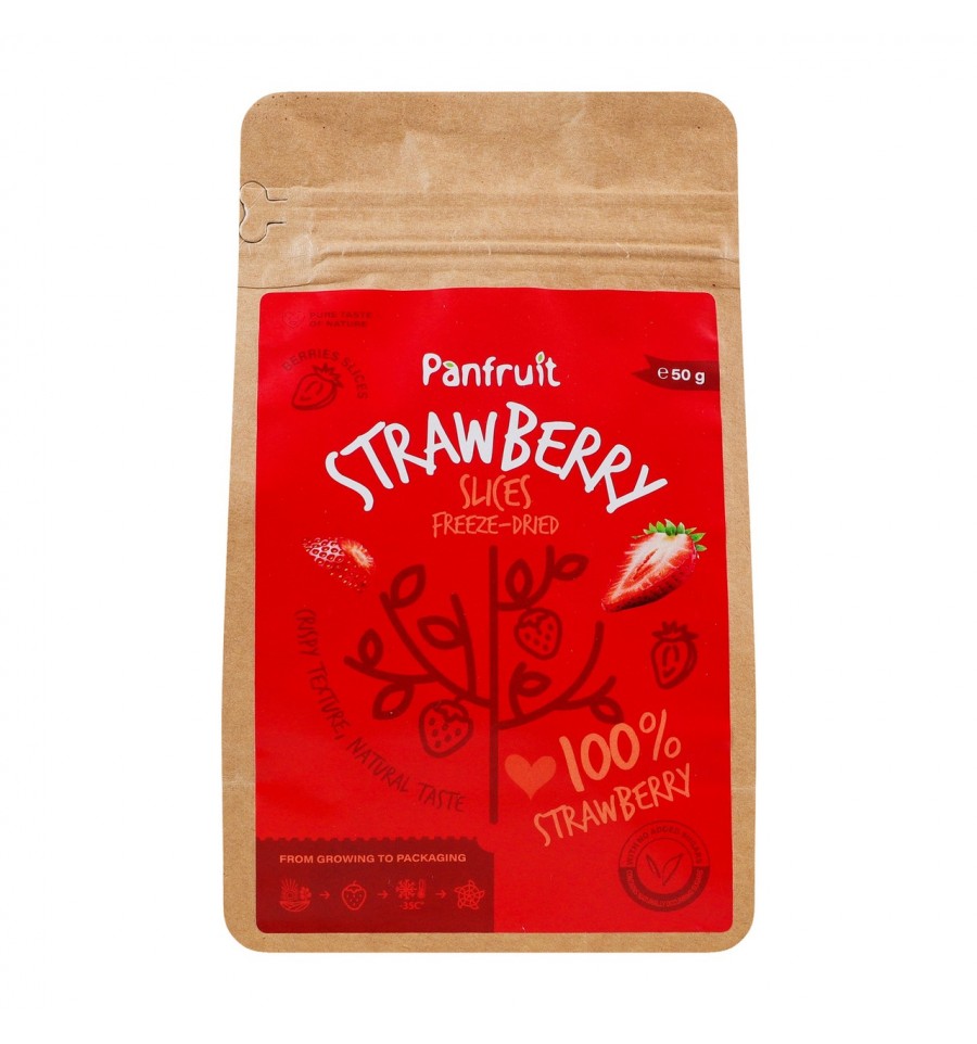 Полуниця Panfruit сублімована скибками 50г. Склад: полуниця сублімована скибками. Енергетична цінність продукту: 1630кДж/100г, 386ккал/100г. Поживна (харчова) цінність продукту: білки - 7г/100г, жири - 0г/100г, насичені жири - 0г/100г, вуглеводи - 79г/100г, сіль - 0г/100г. Рекомендовані способи застосування/вживання: готове до вживання. Чудово підходить для перекусів, випічки, десертів, смузі та шоколаду. Умови зберігання: зберігати за температури не вищої ніж +25ºC і відносній вологості повітря не більше 75%. Сухе, прохолодне місце. Застереження/міри безпеки: не використовувати у випадку пошкодження або відсутності захисної мембрани. Не вживаи у випадку харчової непереносимості. Термін придатності: 2 роки. Термін придатності після відкриття продукту: 7 днів. Країна виробник: Україна. Виробник: ТОВ Панфрут Україна. Адреса виробничих потужностей: вул. Шкільна, 77а, с. Дівочки, Житомирський р-н, Житомирська обл., Україна, 12340. Маса нетто: 50г.