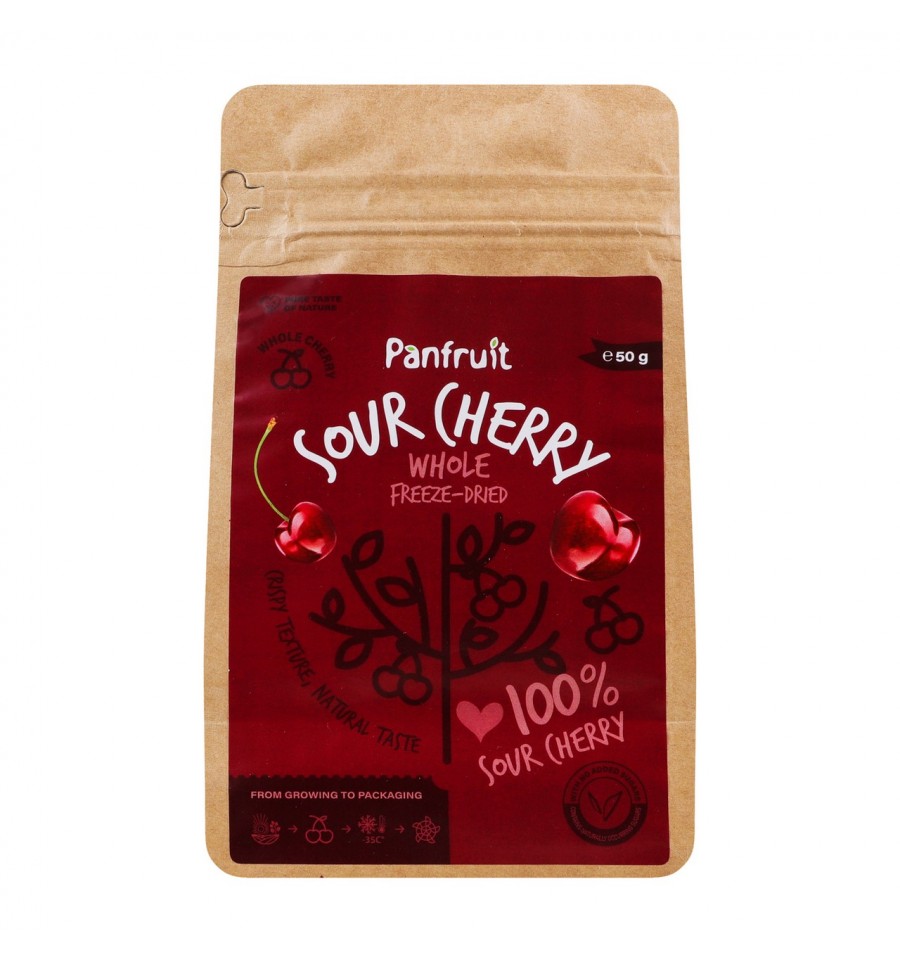 Вишня Panfruit сублімована ціла 50г. Склад: вишня сублімована ціла. Енергетична цінність продукту: 1380кДж/100г, 330ккал/100г. Поживна (харчова) цінність продукту: білки - 6г/100г, жири - 0г/100г, насичені жири - 0г/100г, вуглеводи - 80г/100г, сіль - 0г/100г. Рекомендовані способи застосування/вживання: готове до вживання. Чудово підходить для перекусів, випічки, десертів, смузі та шоколаду. Умови зберігання: зберігати за температури не вищої ніж +25ºC і відносній вологості повітря не більше 75%. Сухе, прохолодне місце. Застереження/міри безпеки: не використовувати у разі пошкодження або відсутності захисної мембрани. Не вживати у випадку харчової непереносимості. Термін придатності: 2 роки. Термін придатності після відкриття продукту: 7 днів. Країна виробник: Україна. Виробник: ТОВ Панфрут Україна. Адреса виробничих потужностей: вул. Шкільна, 77а, с. Дівочки, Житомирський р-н, Житомирська обл., Україна, 12340. Маса нетто: 50г.