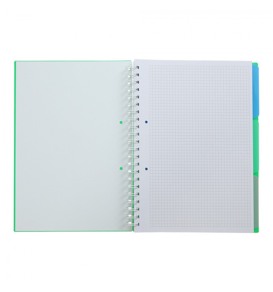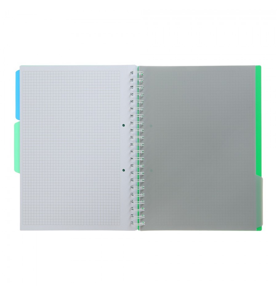 Зошит на пружині БРАЙТ - для ведення записів, конспектів, нотаток, чернеток, графічних замальовок тощо. Може використовуватися працівниками офісів та виробництв, державних установ, фінансових організацій, учнями, студентами та викладачами.120 аркушів формат А4 внутрішній блок: білий офсетний папір щільністю 70 г/м² містить 3 різнокольорові пластикові розділювачі всередині внутрішнього блоку, що дозволить зручно систематизувати різні записи в одному зошиті лініювання в клітинку матеріал обкладинки: жорсткий пластик, який захищає записи від намокання, зминання та забруднення тип скріплення: металева пружина збоку, яка забезпечує легке перегорнання аркушів та комфортне письмо з обох сторін має мікроперфорацію аркушів для легкого та рівного їх відділення аркуші внутрішнього блоку мають отвори для підшивання у швидкозшивач колір обкладинки зелений