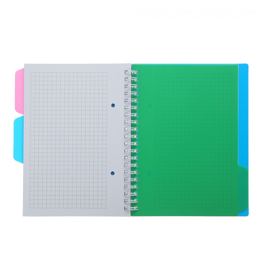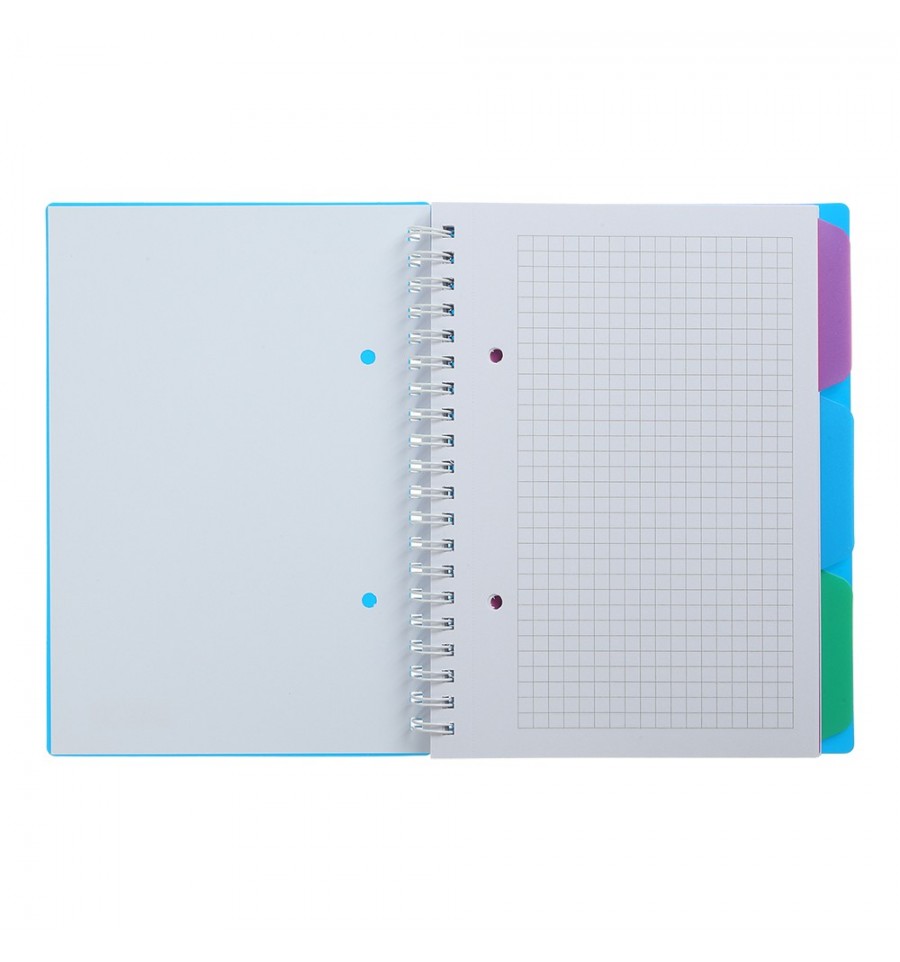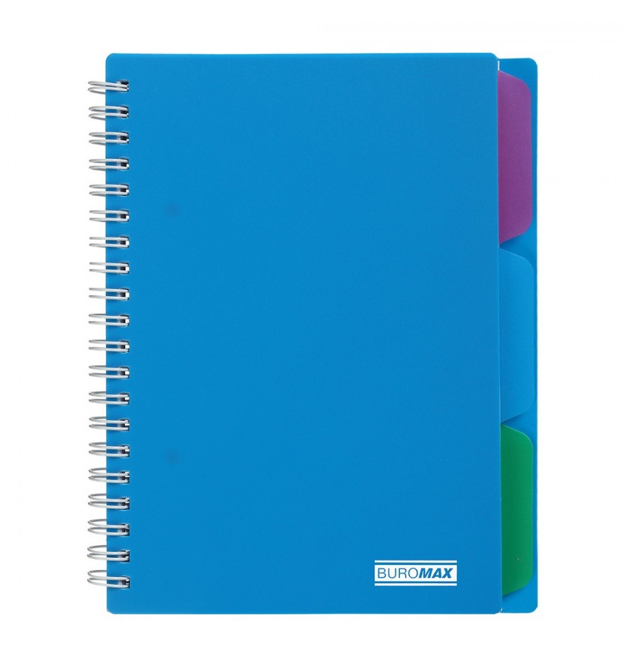 Зошит на пружині БРАЙТ - для ведення записів, конспектів, нотаток, чернеток, графічних замальовок тощо. Може використовуватися працівниками офісів та виробництв, державних установ, фінансових організацій, учнями, студентами та викладачами.100 аркушів формат В6 внутрішній блок: білий офсетний папір щільністю 70 г/м² містить 3 різнокольорові пластикові розділювачі всередині внутрішнього блоку, що дозволить зручно систематизувати різні записи в одному зошиті лініювання в клітинку матеріал обкладинки: жорсткий пластик, який захищає записи від намокання, зминання та забруднення тип скріплення: металева пружина збоку, яка забезпечує легке перегорнання аркушів та комфортне письмо з обох сторін має мікроперфорацію аркушів для легкого та рівного їх відділення аркуші внутрішнього блоку мають отвори для підшивання у швидкозшивач колір обкладинки синій