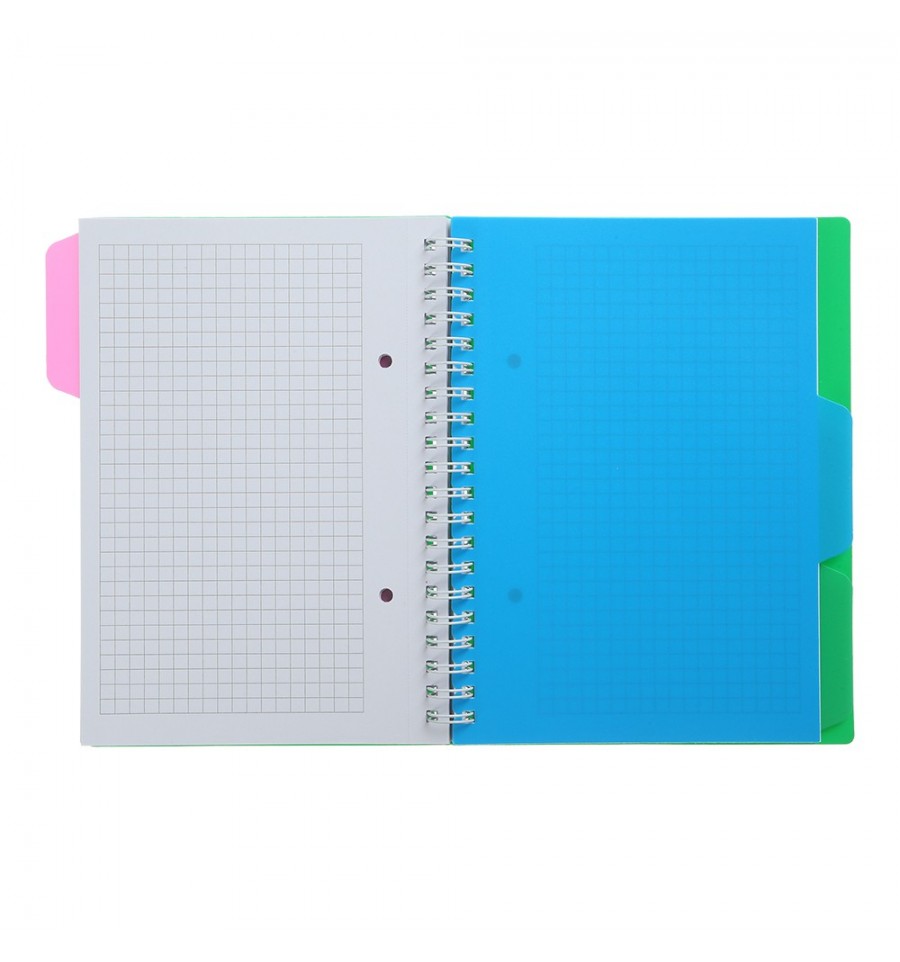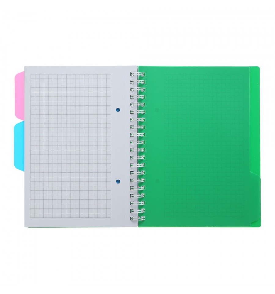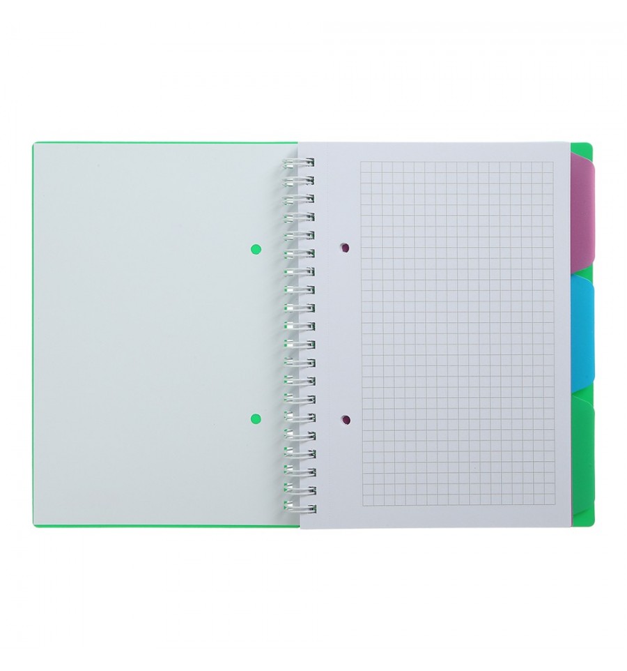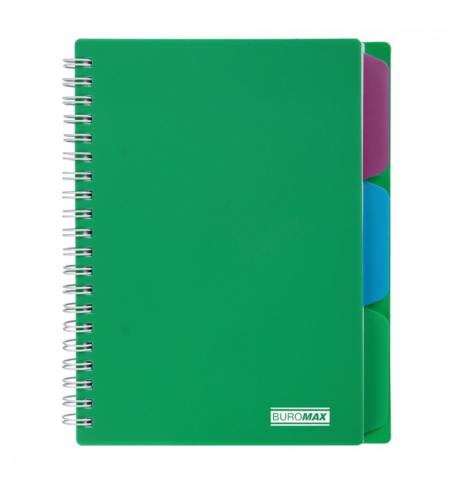 Зошит на пружині БРАЙТ - для ведення записів, конспектів, нотаток, чернеток, графічних замальовок тощо. Може використовуватися працівниками офісів та виробництв, державних установ, фінансових організацій, учнями, студентами та викладачами.100 аркушів формат В6 внутрішній блок: білий офсетний папір щільністю 70 г/м² містить 3 різнокольорові пластикові розділювачі всередині внутрішнього блоку, що дозволить зручно систематизувати різні записи в одному зошиті лініювання в клітинку матеріал обкладинки: жорсткий пластик, який захищає записи від намокання, зминання та забруднення тип скріплення: металева пружина збоку, яка забезпечує легке перегорнання аркушів та комфортне письмо з обох сторін має мікроперфорацію аркушів для легкого та рівного їх відділення аркуші внутрішнього блоку мають отвори для підшивання у швидкозшивач колір обкладинки зелений