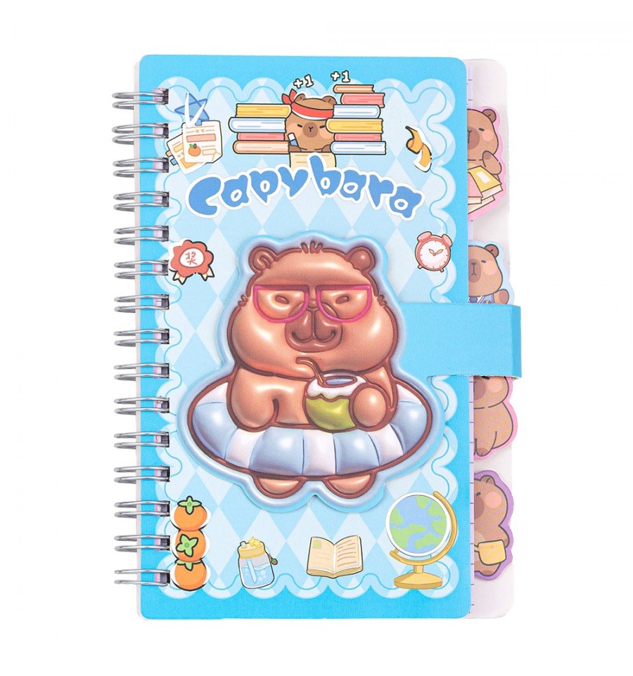 Блокнот CAPYBARA від ZiBi - оригінальний, дуже симпатичний записник для нотаток, чернеток, записів, замальовок. Може використовуватися для ведення особистого щоденника, підійде для маленького милого подаруночка чи сюрпризу.формат А6 60 аркушів обкладинка м'яка картонна, захистить записи від зминання внутрішній блок з білого офсетного паперу щільністю 65 г/м² лініювання: клітинка, двостороннє тип скріплення: металева пружина збоку, дозволяє легко перевертати аркуші та зручно писати з обох боків має картонний хлястик із застібкою на липучці, який допоможе зафіксувати блокнот в закритому положенні має 4 кольорові розділювачі з дизайнерським малюнком