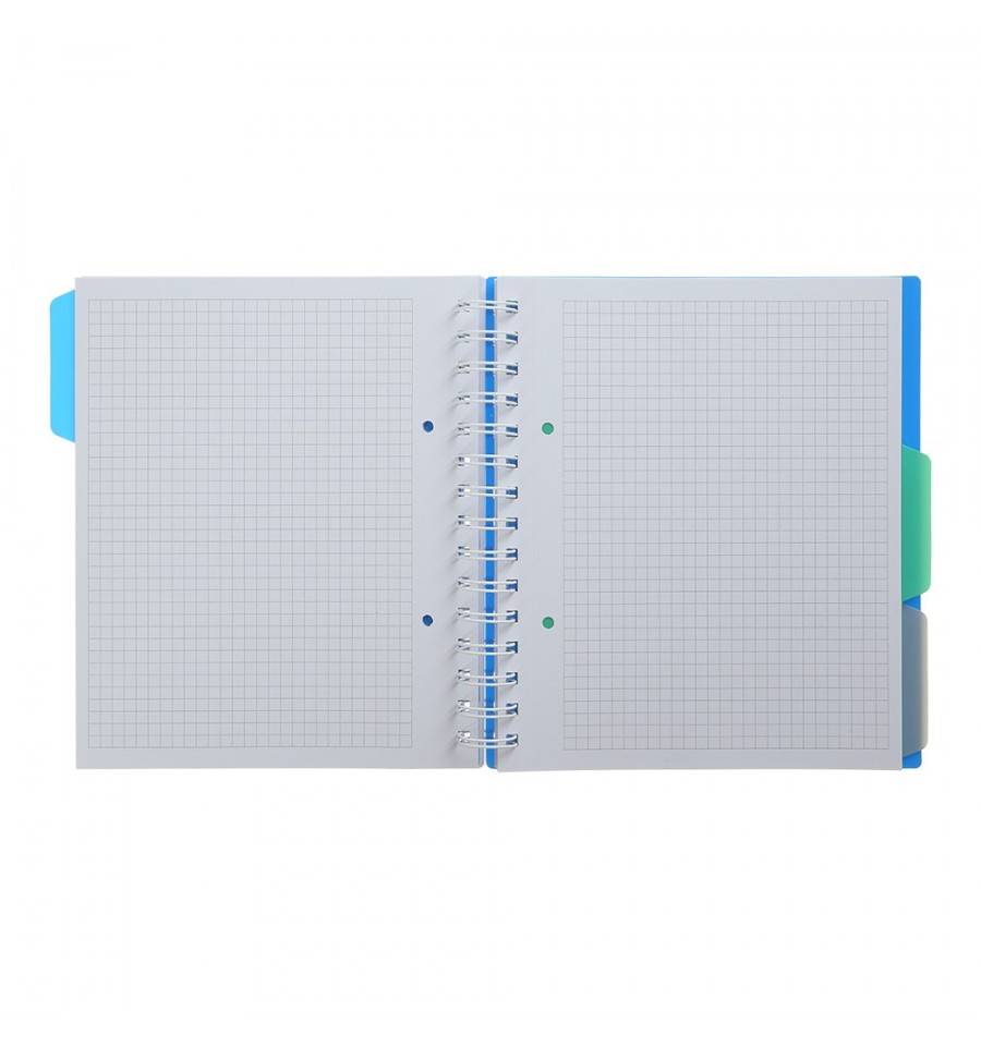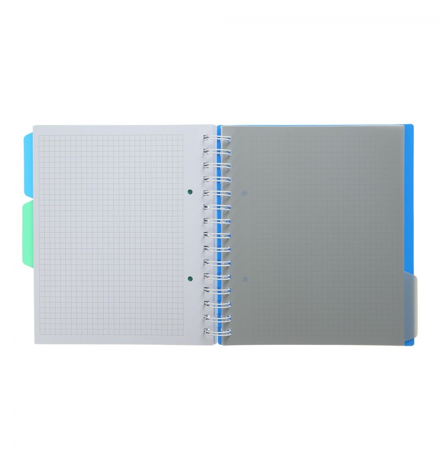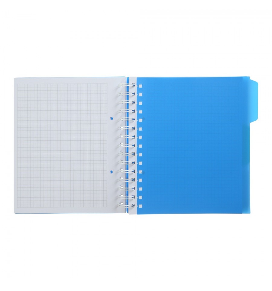 Зошит на пружині КЛАСІК- для ведення записів, конспектів, нотаток, чернеток, графічних замальовок тощо. Може використовуватися працівниками офісів та виробництв, державних установ, фінансових організацій, учнями, студентами та викладачами.120 аркушів формат міні В5 (170х205 мм) внутрішній блок: білий офсетний папір щільністю 70 г/м² містить 3 різнокольорові пластикові розділювачі всередині внутрішнього блоку, що дозволить зручно систематизувати різні записи в одному зошиті лініювання в клітинку матеріал обкладинки: жорсткий пластик, який захищає записи від намокання, зминання та забруднення тип скріплення: металева пружина збоку, яка забезпечує легке перегорнання аркушів та комфортне письмо з обох сторін має мікроперфорацію аркушів для легкого та рівного їх відділення аркуші внутрішнього блоку мають отвори для підшивання у швидкозшивач колір обкладинки синій