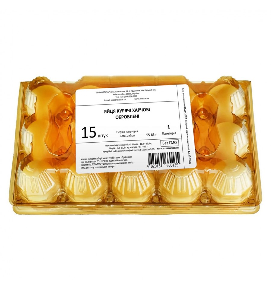 Яйця курячі харчові оброблені, 1 категорія. Склад: яйця курячі харчові. Калорійність в 100г продукту: 150-160 ккал. Харчова (поживна) цінність у 100г продукту: Білки - 11,0-13,0 г., Жири - 9,00-11,50 г, Вуглеводи - 0,7-0,9 г. Умови зберігання: зберігати за температури від 4 до + 25°C - 60 діб з дати виробництва. Зберігати при відносній вологості повітря 70-75% у складських приміщеннях та 85-88% в холодильних камерах . Виробник: ТОВ ОВОСТАР. Країна виробництва: Україна. Адреса виробничих потужностей: буд. 11, вул. Колгоспна, Васильківського р-ну, Київської обл, 08635. Вміст ГМО: Не містить. Маса нетто яйця: 55,00-65,00 г
