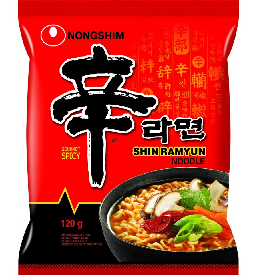 Локшина швидкого приготування зі смаком грибів, гостра. Склад: Локшина 89 % (борошно ПШЕНИЧНЕ, картопляний крохмаль, олія пальмова, сіль, регулятори кислотності: E 501, E 500, E 339, антиоксидант: E 306, емульгатор: E322 (містить СОЮ), приправа (екстракт дріжджів, СОЄВІ боби, часник, ПШЕНИЧНИЙ крохмаль), барвник: Е101)/ Смако-ароматична суміш 9%: приправа (гідролізований рослинний білок (СОЯ), мальтодекстрин, дріжджовий екстракт, сіль, борошно ПШЕНИЧНЕ), сіль, приправа (мальтодекстрин, перець чорний, перець червоний чилі, часник, борошно кукурудзяне) підсилювачі смаку і аромату: E621, E627, E631, цукор, глюкоза, гриби «Шиїтакі»)/ Пластівці овочево-грибні 2%: капуста пак-чой, гриби «Шиїтаке», текстурований рослинний білок (СОЯ, ГЛЮТЕН), морква, червоний перець чилі, цибуля. ПРОДУКТ МОЖЕ МІСТИТИ ЯЧМІНЬ, РАКОПОДІБНІ, ЯЙЦЯ, РИБУ, АРАХІС, МОЛОКО, СЕЛЕРУ, ГІРЧИЦЮ, НАСІННЯ КУНЖУТУ, МОЛЮСКІВ. Поживна цінність на 100 г продукту: енергетична цінність – 1779 кДж / 422 ккал, жири – 13,0 г, з них насичені – 6,1 г, вуглеводи – 68,0 г, з них цукри – 3,0 г, білки – 8,2 г, сіль – 3,8 г. Спосіб приготування: додайте локшину та вміст пакетиків у 550 ml (мл) окропу. Зачекайте 4 ½ хвилини. Перед споживанням добре перемішайте. На упаковці зображено спосіб сервірування. Дата «Краще спожити до:» та номер партії вказані на бічній або лицьовій стороні упаковки. Зберігати в сухому прохолодному, захищеному від прямих сонячних променів місці. Країна походження: Південна Корея. Виробник: NONGSHIM CO., LTD, 112, YEOUIDAEBANG-RO, DONGJAK-GU, SEOUL, KOREA (НОНГШІМ КО., ЛТД, 112, Йоуідабанг-ро, Донжак-гу, Сеул, Південна Корея). Імпортер: ТОВ «Метро Кеш енд Кері Україна», 02140, Україна, м. Київ, Проспект П. Григоренка, буд. 43. З питань щодо продукту звертайтесь за тел. гарячої лінії імпортера 0800501401 (безкоштовно в межах України). Локшина: 107,5 g (г). Смако-ароматична суміш: 10,5 g (г). Овочево-грибні пластівці: 2,0 g (г). Маса нетто: 120 g (г)