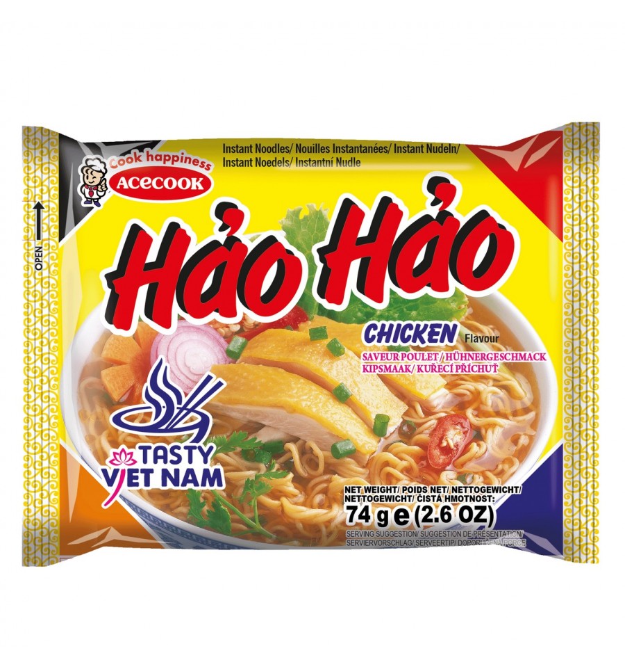 Локшина швидкого приготування зі смаком курки. ACECOOK HẢO HẢO CHICKEN FLAVOR. Склад: Локшина (91,5%): пшенична мука,рослинна олія (пальмова олія,антиоксиданти (Е320,Е321)),крохмаль,сіль,цукор,регулятори кислотності (Е451,Е501,Е500),глутамат натрію (Е621). Супова основа (6,3%): сіль,цукор,підсилювачі смаку (Е621,Е631,Е627),крохмаль,спеції,барвник (проста карамель (Е150а)),сушена зелена цибуля,рослинна олія (пальмова олія,антиоксиданти (Е320,Е321)),екстракт дріжджів,двоокис кремнію (Е551),штучний ароматизатор курки 0,01% (ячмінь,молоко). Олія (2,2%): рослинна олія (пальмова олія,антиоксиданти (Е320,Е321)),спеції,каротин (Е160a). Алергени: містить пшеничну муку,ячмінь,молоко. Може містити рибу. Бажано вжити до: дивись на упаковці. Спосіб приготування: - Покладіть локшину і вміст пакетиків з приправами в глибоку тарілку. - Налийте 400 мл киплячої води,накрийте тарілку і зачекайте 3 хвилини. - Добре перемішайте локшину перед подачею. Енергетична цінність (калорійність) на 100г продукту: 1880кДж /448 ккал. Поживна (харчова) цінність на 100г продукту: жири - 17,0г (з яких насичені - 9,6г); вуглеводи - 64,0г (з яких цукру - 7,0г); клітковина - 2,9г; білки - 8,7г; сіль - 6,2г. Виробник: ACECOOK VIETNAM JSC (завод японської компанії ACECOOK). Lot II-3,Road No. 11,Industrial Group II,Tan Binh Industrial Park,Tan Phu. District,Хошимін/Вʼєтнам. Імпортер / Дистрибʼютор в Україні: ТОВ «Стабовіта». вул. Центральна,<-В,с. мала Олександрівка,Бориспільський р-н,Київська обл. 08320,Україна. Тел.: 0443912379. mail@fdmsukraine.com. Вага нетто: 74 г.