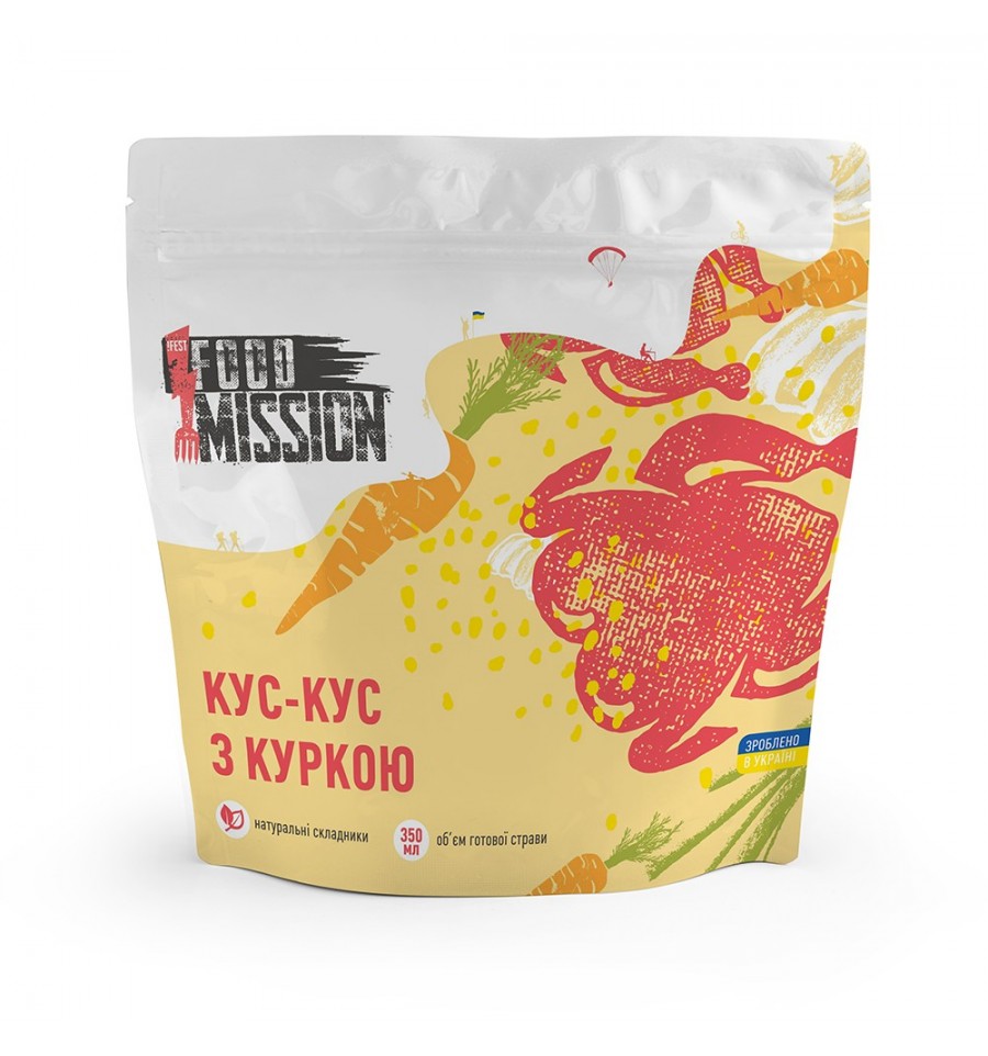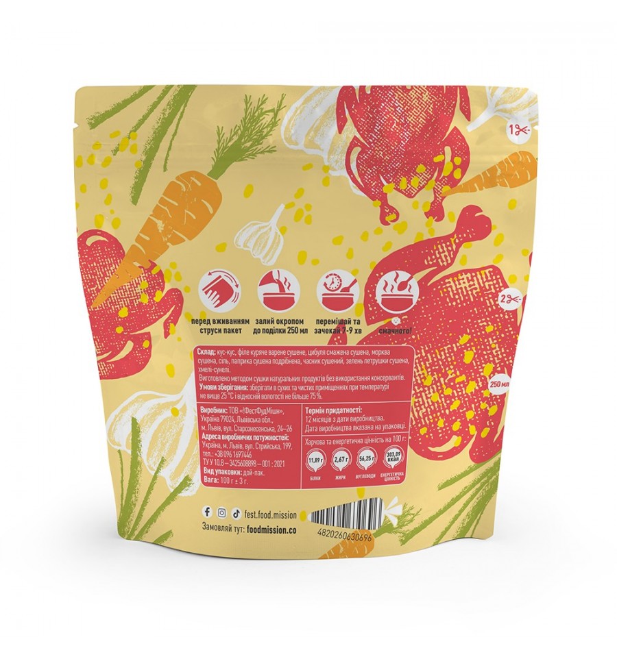 Страва швидкого приготування. Склад:кус-кус, філе куряче варене, цибуля смажена сушена, морква сушена, сіль, паприка сушена подрібнена, часник сушений, зелень петрушки сушена, хмелі-сунелі. Виготовлено методом сушки натуральних продуктів без використання консервантів.Спосіб приготування: перед вживанням струсити пакет, відкрити та залити страву окропом до поділки 250 мл, ретельно перемішати, закрити замок на пакеті та зачекати протягом 7-9 хвилин.. Харчова та енергетична цінність Білки 11,89 г Жири 2,67 г Вуглеводи 56,25 г Енергетична цінність 303,09 Ккал Об'єм готової страви 350 мл Вага 100 г Термін придатності 12 місяців. у окропом до поділки 250 мл, ретельно перемішати, закрити замок на пакеті та зачекати протягом 7-9 хвилин.