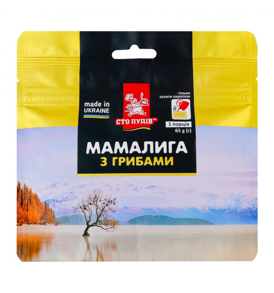 Мамалига Сто пудів з грибами 65г. Склад: кукурудзяні пластівці, цибуля сушена, гриби білі сушені - 3%, бульйон зі смаком курки (білковий соєвий гідролізат, мальтодекстрин, глутамат натрію (Е621), екстракт цибулі-порей, екстракт селери, екстракт дріжджів зі смаком курчати, олія гідрогенізована пальмова), сіль кухонна. Енергетична цінність продукту: 1400.2кДж/100г, 334.43ккал/100г. Поживна (харчова) цінність продукту: білки - 7.38г/100г, жири - 1.13г/100г, насичені жири - 0.21г/100г, вуглеводи - 72.98г/100г, з них цукри - 8.91г/100г, сіль - 2.54г/100г. Рекомендовані способи застосування/вживання: 1. Пакет струсити та відкрити. 2. Додати 300мл окропу (приблизно до відмітки 7 на шкалі пакету), перемішати. 3. Закрити замок на пакеті та дати постояти 10 хвилин. 4. Відкрити, ретельно перемішати. Смачного. Умови зберігання: чисте, сухе, добре вентильоване, без потрапляння прямих сонячних променів і шкідників місце. Термін придатності: 1 рік. Країна виробник: Україна. Виробник та адреса виробника: ТОВ Проденерго, вул. Гв. Широнінців, 45, м. Харків, Україна, 61170. Адреса виробничих потужностей: вул. Гв. Широнінців, 45, м. Харків, Україна, 61170. Маса нетто: 65г.