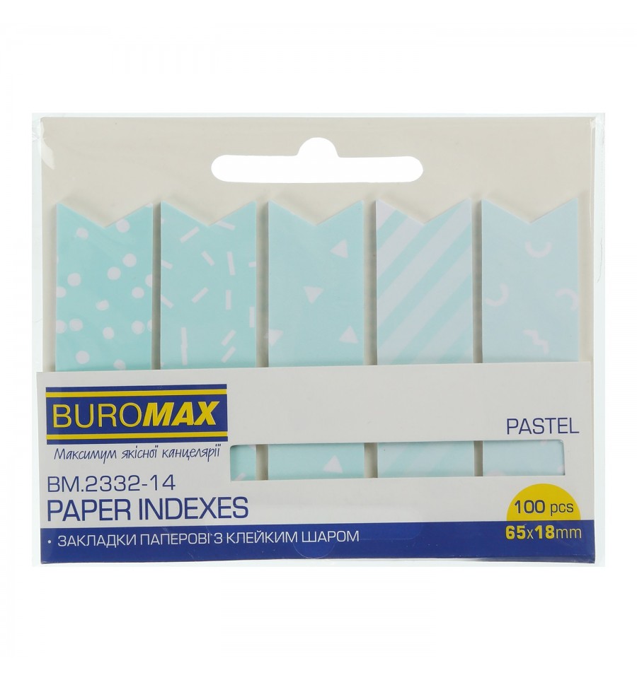 Паперові закладки з клейким шаром PASTEL від BUROMAX ідеально підійдуть для виділення необхідної інформації, створення записів у блокнотах, документах, книгах, підручниках, каталогах тощо. Допомагають організовувати кольорове кодування сторінок! Підходять для використання співробітниками офісів, на рецепціях, школярами, студентами та просто у повсякденному житті. Надійно закріплюються на папері та різноманітних гладких поверхнях Можливе багаторазове використання (переклеювання) - легко видаляються з поверхонь, не залишаючи слідів клею Підходять для написання нотаток різним письмовим приладдям (ручками, олівцями, лайнерами тощо) Колір: блакитний пастельний з принтом Розмір закладки: 65 х 18 мм Щільність паперу 80 г/м² 100 шт. (по 20 шт. у 5-ти блоках з різними малюнками), розміщені на картонній підкладці Упаковка: прозорий блістер з європідвісом