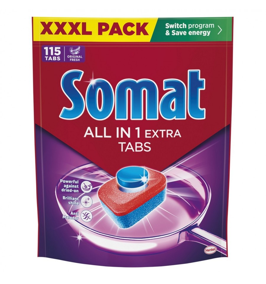 Таблетки для посудомийної машини Somat Все в одному Екстра для досконалої чистоти. Склад: 5 - 15 % відбілювач на основі кисню, фосфонати, < 5 % полікарбоксилати, неіоногенні ПАР. Також: Ензими, Ароматизатор (Лімонен). Використання: 1.Легко і чисто: не потрібно розгортати, плівка водорозчинна. 2. Покладіть таблетку прямо в дозатор засобу для миття Вашої посудомийної машини. 3. Не кладіть таблетку у корзину зі столовими приборами. Не кладіть таблетку в дозатор для солі. Таблетки Somat "Все в одному Екстра" дозволяють досягнути досконалої чистоти, навіть коли горить індикатор відсутності ополіскувача або солі. В обох випадках, функції ополіскувача та пом`якшення води у Вашій посудомийній машині зберігаються. Завжди можливе додаткове використання солі та/або ополіскувача. Для жорсткої води (>21° dH) використовуйте Somat "Все в одному Екстра" у поєднанні із спеціальною сіллю Somat. Жорсткість води можна дізнатись на Вашій місцевій водопровідній станції. Виробник та адреса виробника: "Хенкель Сербія д.о.о.", Булевар Ослобожденія 383, 11000 Бєлград, Сербія. Умови зберігання: +5 до +40°C. Термін придатності: 730 дн. Маса нетто: 1,909 кг